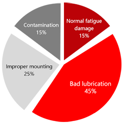 The bearing life we generally talk about refers to the total revolutions of any rolling element or any raceway in a bearing before spalling fatigue occurs, or the working hours at a certain speed. The bearing life discussed in most textbooks is also the theoretical design life around fatigue life. However, in many cases, the actual service life of the bearing is far from the theoretical fatigue life. According to statistics, more than 80% of the early failure of the bearing is not caused by the normal fatigue of the bearing. As shown in the figure on the right, only 15% of bearing damage is theoretical fatigue damage. Most bearings have been damaged due to poor lubrication, improper installation or pollution before running to bearing fatigue damage.
